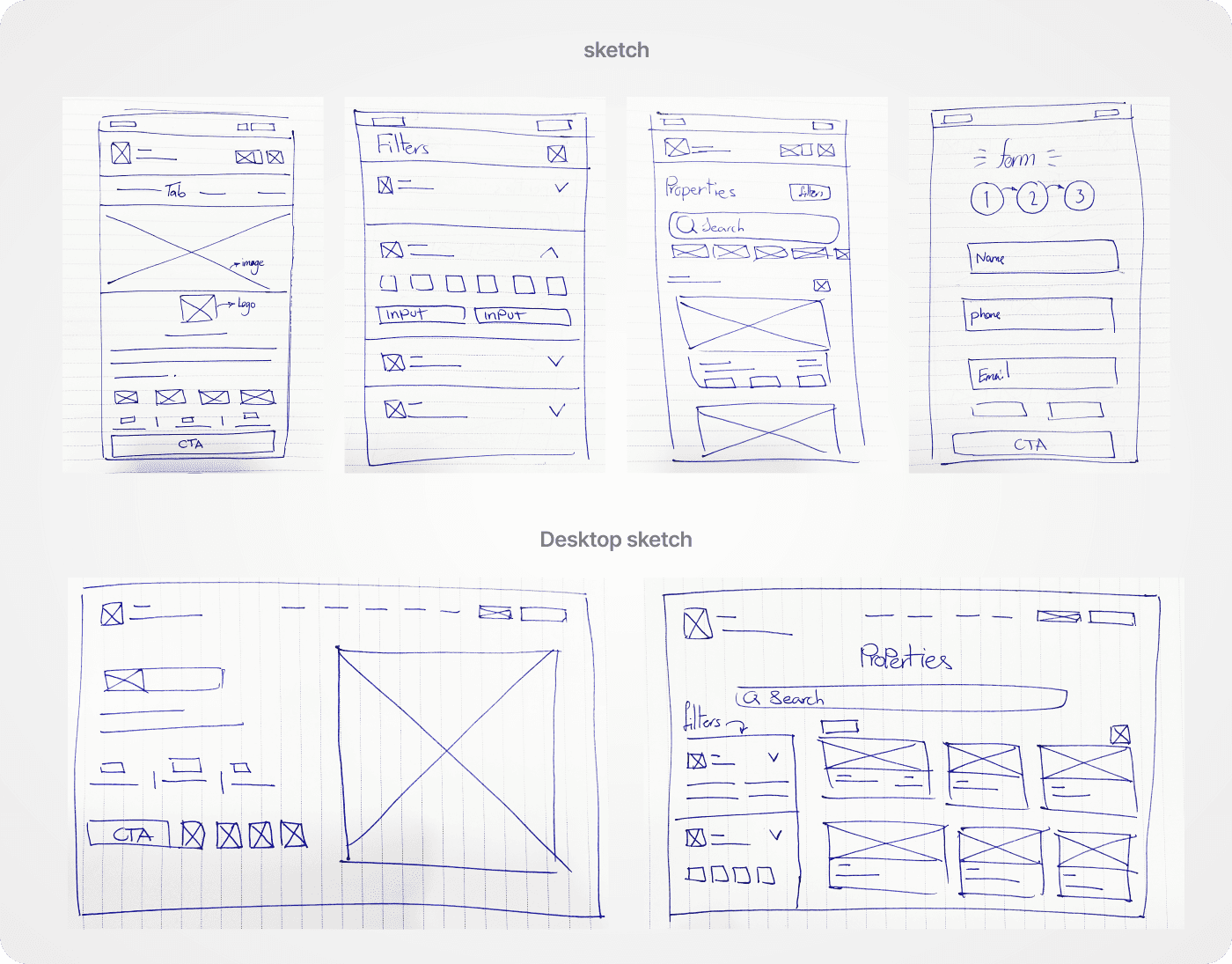 Initial hand-drawn sketches and digital outlines were generated to visualize the layout and critical workflows. These "Rough Sketches" focused on the placement of essential agent tools, such as the Dashboards, Property Listing Management, and Client Communication Hub, establishing the structural skeleton of the application.